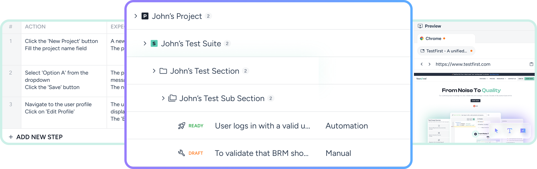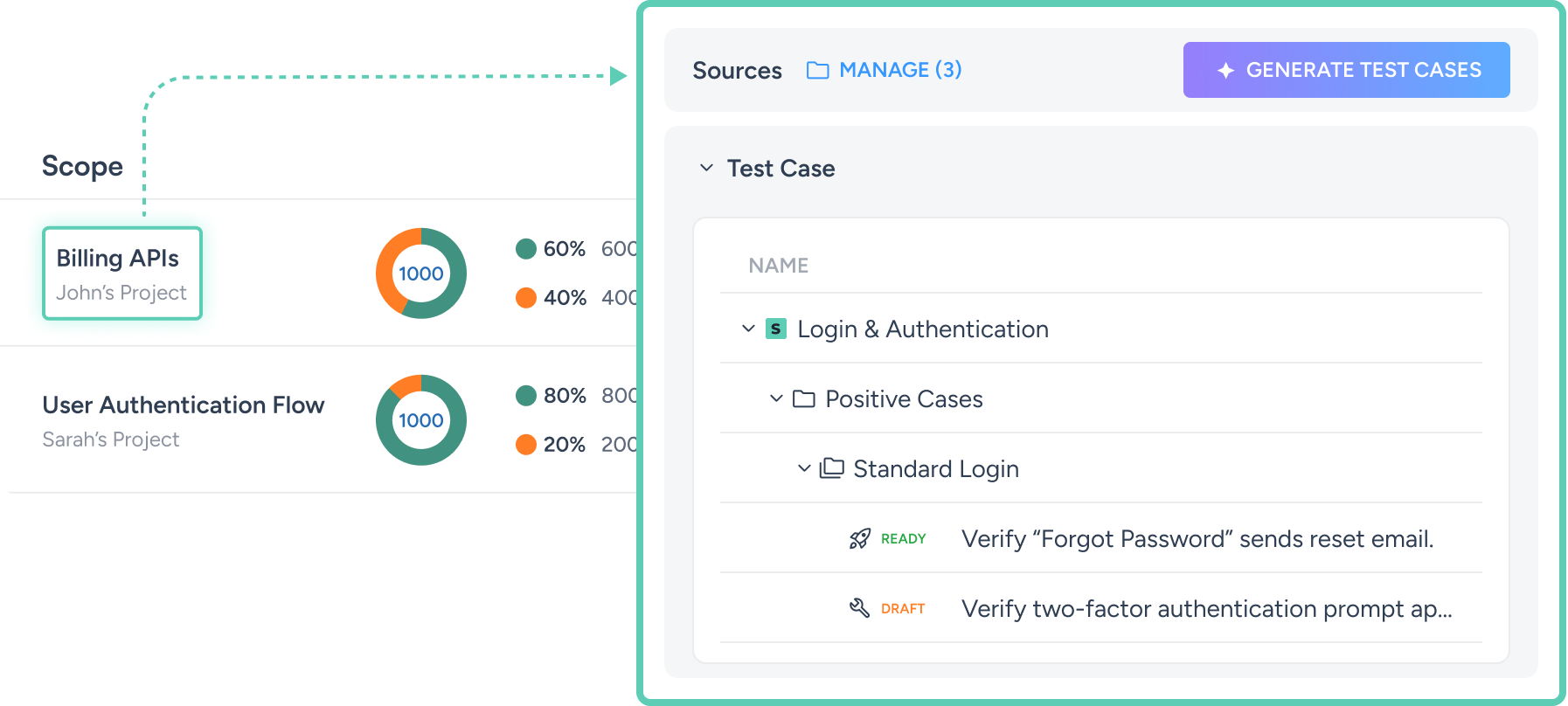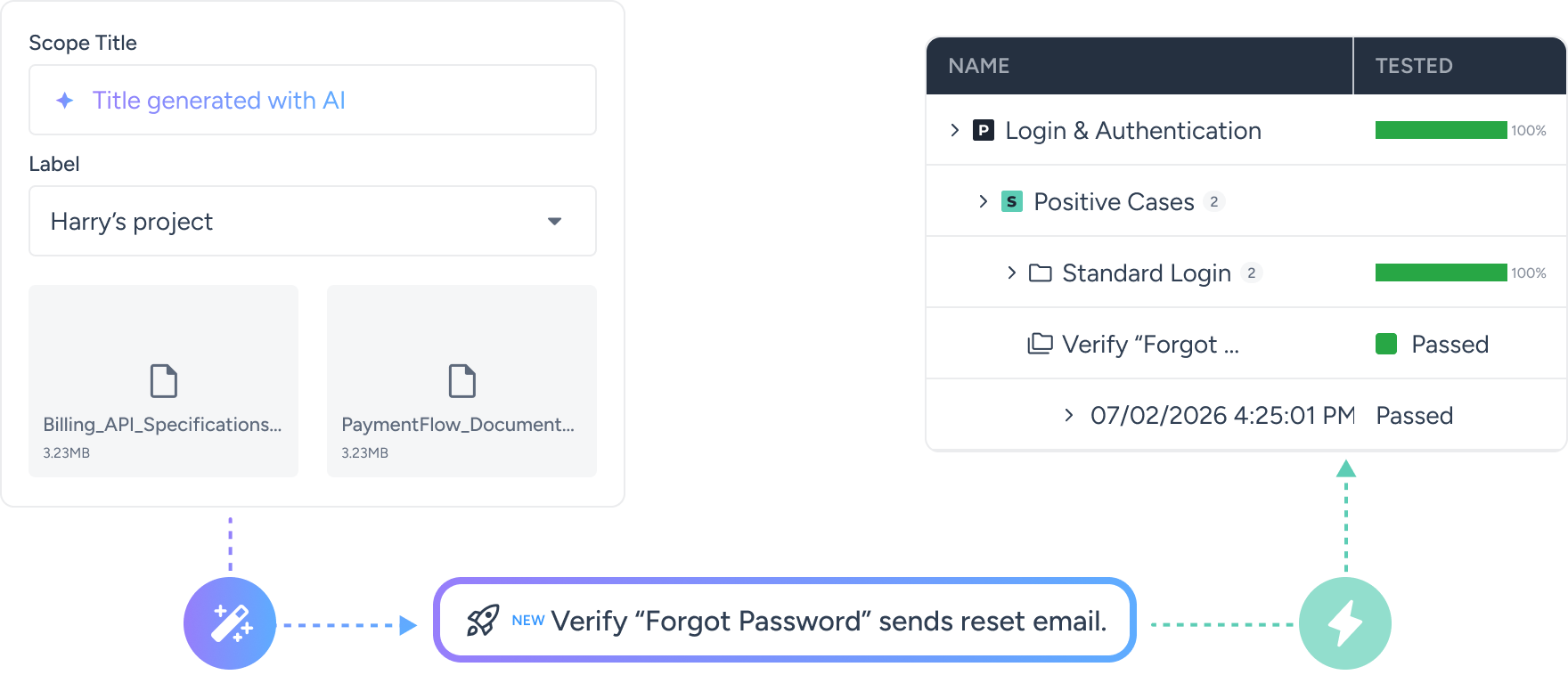 TestFirst 3.0 brings test generation to the center of your workflow. Use your documents to automatically identify and select what to cover, then generate clear, reliable tests in minutes. With Test Scopes, you can define and control coverage intentionally: what’s in, what’s out, and what runs. Suites stay lean as your product evolves. And with a simplified, stitched UI, everything now feels like one unified platform from generation to execution and management.